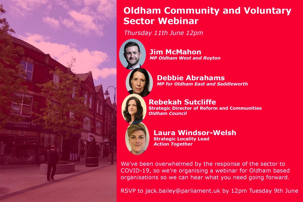 On the back of their successful webinar with Oldham based businesses, Jim McMahon MP and Debbie Abrahams MP are hosting an online support session for community and voluntary sector organisations based in Oldham and Saddleworth.