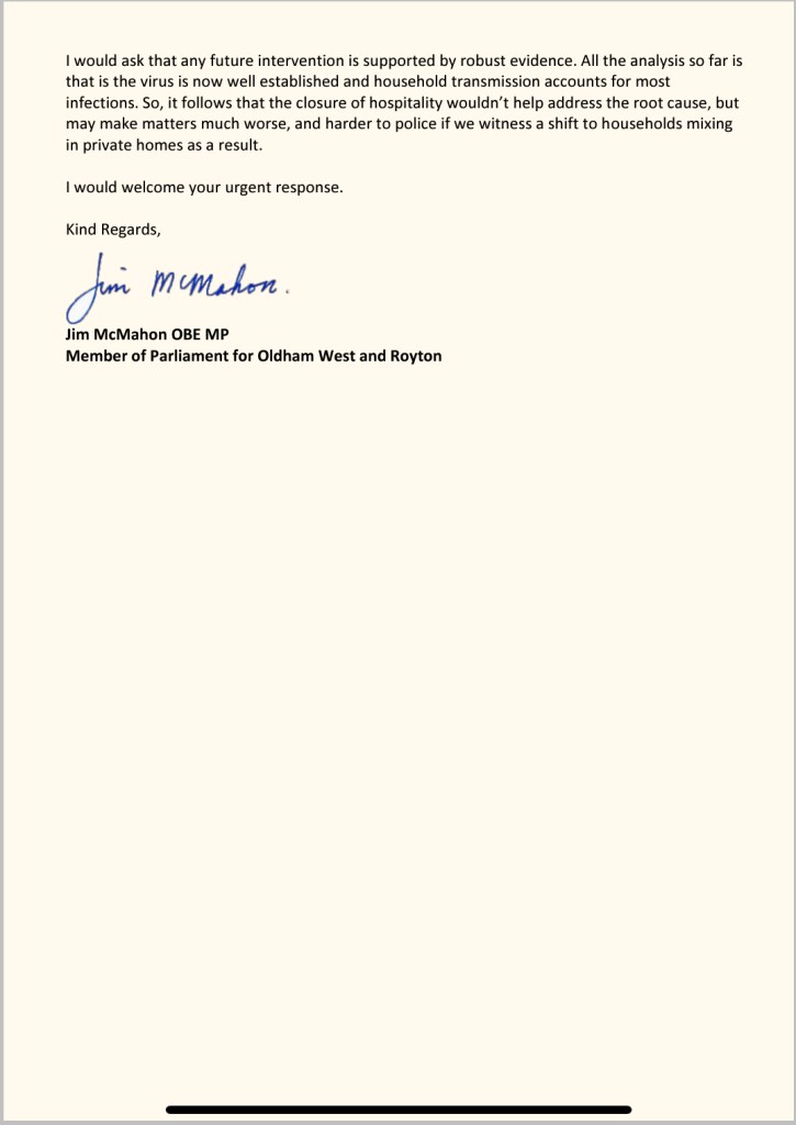 Speaking after the letter was sent Jim said, “The patchwork of restrictions is a mess, it doesn’t make sense to me or to any of my constituents that there are places in Greater Manchester with a higher infection rate than ours but they are subject to different restrictions.”