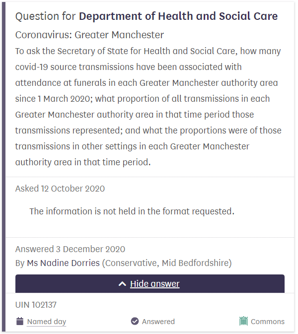 Oldham West and Royton MP Jim McMahon used a written parliamentary question to ask the Department of Health and Social care to share data around the number of infections that were sourced to funeral attendance. Nearly two months on, the government was unable to point to any evidence, instead a reply from the Minister insisted, “The information is not held in the format requested.”